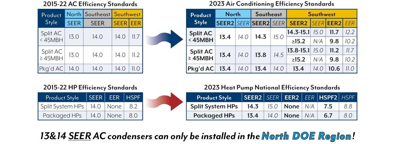- The new “South” line of split system condensers will be released by the end of Q3-2022 so you can start winding down inventory of current models, and order new models to stock ahead of the 2023 deadline.